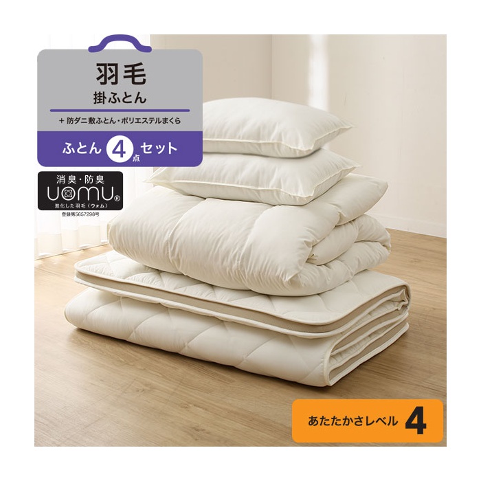 원본상품명: 4点セット羽毛掛ふとん+防ダニ敷ふとんポリエステルまくら2個付き ダブル(ウモウ&ボウダニ D) 送料無料玄?先?納品