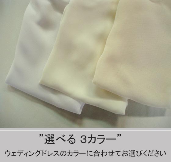 ホワイト、オフホワイト、アイボリーの3色をご用意。 ウエディングドレスに合わせてお選びいただけます。 (3枚目写真:左ホワイト、真ん中オフホワイト、右アイボリーです)