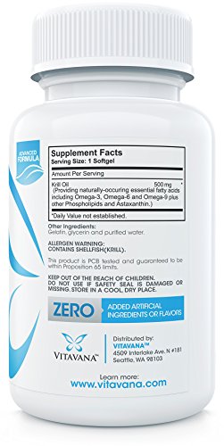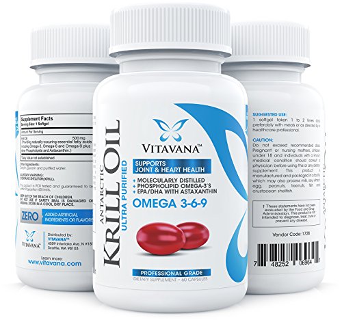 -. Binding : Health and Beauty -. Brand : Vitavana -. EAN : 0748252069641 -. Feature : SUSTAINABLY HARVESTED FROM THE PRISTINE COLD WATERS OF ANTARCTICA • We use a special patented form of krill oil called KriaXanthin® which is sustainably harvested from the cold waters of Antarctica. The krill oil fishery is a highly regulated sustainable fishery overlooked by the Marine Stewardship Council (MSC). Krill are the largest biomass in world and the yearly harvest accounts for less than 1% of this entire biomass making this one of the most sustainable fisheries on the planet / BOTTLED IN THE USA IN AN NSF CERTIFIED, FDA COMPLIANT FACILITY • Our krill oil is molecularly distilled and purity tested in our lab to ensure you receive the highest quality and most potent krill oil supplement available. Molecular distillation is a process of separation, purification and concentration of complex thermally sensitive molecules such as the long-chain n-3 polyunsaturated fatty acids (PUFAs) found in our krill oil. Vitavana Krill Oil is proudly bottled in the USA / OUR #1 BEST-SELLING KRILL OIL SUPPLEMENT • Looking for a krill oil supplement but feel overwhelmed by all of the choices? Your search is over... Vitavana Krill Oil is made of a patented form of krill oil sustainably harvested from the ice cold waters of Antarctica and contains high levels of naturally occurring phospholipid bound EPA, DHA and Astaxanthin. Our small, red krill oil softgels are significantly smaller than fish oil capsules and pack a powerful boost of omega-3's and antioxidants / 100% ANTARCTIC KRILL OIL 1000MG PER SERVING • Some of the clinically studied benefits of krill oil include: support for concentration, memory and learning; helps sustain healthy inflammatory pathways; helps maintain cholesterol levels already in the normal range; healthy mood support; promotes healthy joints; supports the immune system; promotes optimal skin health and more! The omega-3's in krill oil are phospholipid bound resulting in krill oil being more bioavailable and more readily absorbed / 60 DAY UNCONDITIONAL 100% MONEY-BACK GUARANTEE • If for ANY reason you are not 100% satisfied with our krill oil supplement, we will give you a full, 100% hassle-free refund. We offer such a generous money-back guarantee because we want to be your partner in your transition to a healthier life and we are only happy if you are 100% satisfied. Even with our generous money-back guarantee our refund rate is only 2.3%. So what are you waiting for? Order now while supplies last! -. IsAdultProduct : 0 -. Label : Vitavana -. LegalDisclaimer : *These statements have not been evaluated by the Food & Drug Administration. This product is not intended to diagnose, treat, cure, or prevent any disease. -. Manufacturer : Vitavana -. MPN : 748252069641 -. PackageQuantity : 1 -. PartNumber : 748252069641 -. ProductGroup : Health and Beauty -. ProductTypeName : HEALTH_PERSONAL_CARE -. Publisher : Vitavana -. Size : 60 Softgels -. Studio : Vitavana -. Title : Vitavana Krill Oil Omega 3 Supplement :: #1 Triple-Strength Antarctic Krill Oil with EPA/DHA & Astaxanthin (60 Softgels - 2 Month Supply) -. UPC : 748252069641