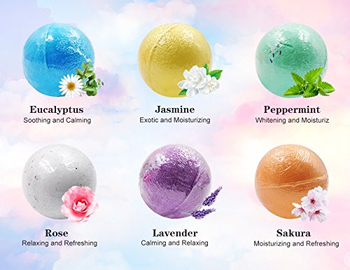 - 【100% Natural】:This Bath Bomb Gift Set includes "Six" Different Scent Bath Fizzer: White Rose;Blue Chamomile;Green Myosotis Sylvatica;Orange Osmanthus;Yellow Jasmine;Purple Lavender.Exploding with Natural essentials oils,enjoy a relaxing and moisturizing Spa treatment with the bath bomb gift set with dried flowers.you will love how you smell after bath.
