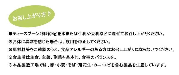 | 様々なビタミンとコラーゲンを飲みやすい抹茶味に仕上げました。水また牛乳、豆乳などに混ぜてお召し上がりください。 |