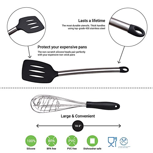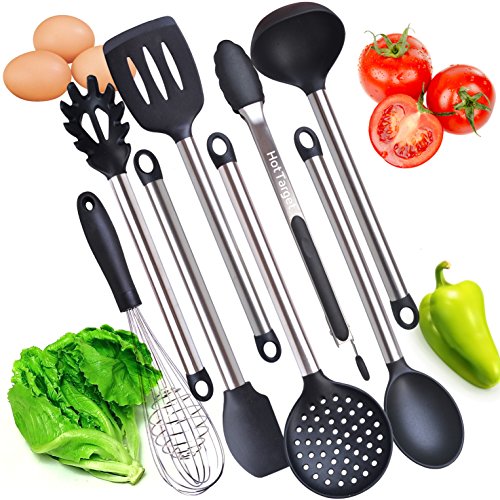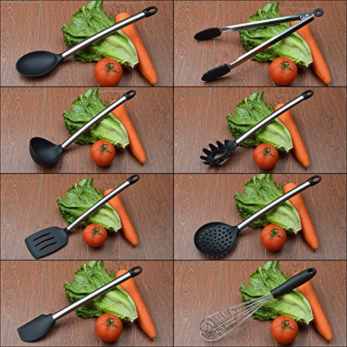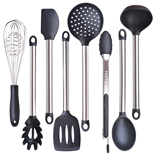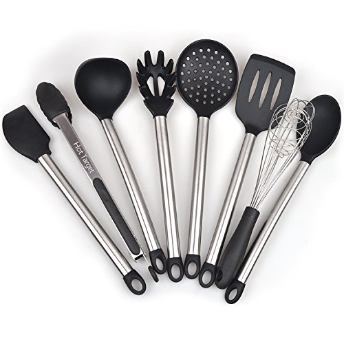 Studio : Hot Target Publisher : Hot Target Product Description This cooking utensils set gives you everything you need to whip up enticing meals with remarkable ease! You'll get a pair of tongs, turner spatula, flex spatula, pasta server, serving spoon, deep ladle, 2 stage whisk and a strainer to complement any dish. But these aren't your regular utensils. We've designed the handles using high-grade stainless steel and made the heads with top-notch silicone, making these the most durable utensils in the market; offered to last you for a lifetime! No bending. No breaking. No rusting. Just unwavering service even with daily use. 0
