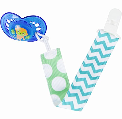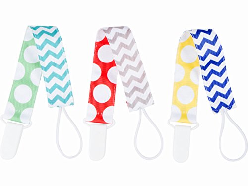 • THE ULTIMATE SET - We know how hard it is to deal with a teething baby. Nonstop crying & no sleep for mom or dad. This is why we designed this set of 5 to include 2 food grade silicone pacifier holders that are made of high quality for your baby to teethe on & soothe their precious gums. You'll also receive 3 binky holders that are double sided with vibrant colors of chevron and polka dots. Regardless of what pacifier your baby uses, this set is compatible with all types!