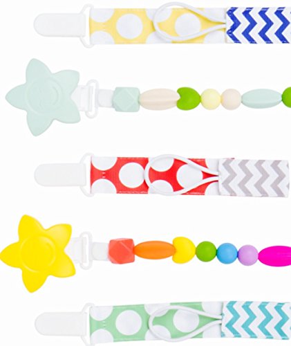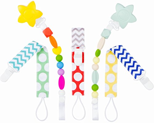 • HIGHLY FUNCTIONAL: Our pacifier clips are very unique because we had the silicone beads customized with different shapes for your baby to have all types of surfaces to chew on. These pacifier clips have many uses for your boy, girl, newborn, or toddler! These pacifier clips work great with teething ring toys, soothie pacifiers, blankets, drool bibs, or even on your baby's stuffed animal or stroller.