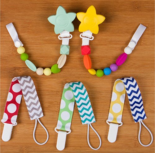 • QUALITY: Quality over quantity any day, right? Get BOTH! Not only do we offer an absurd SET OF 5 pacifier clips, but we also make sure you are getting great quality as well. Our pacigrips are made out of 100% polyester which is smooth and moves up & down easily too. The silicone beads are made of FDA approved food grade silicone and they're also CSPIA approved! The plastic clasps are extremely strong & durable to avoid dirty pacifiers, but gentle enough to protect your baby's clothes.