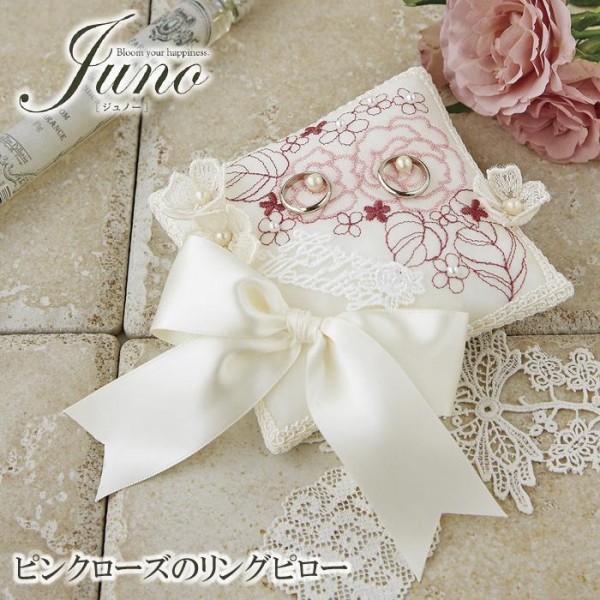 ローズの刺しゅうと大きなりぼんが印象的な、華やかなピローです。