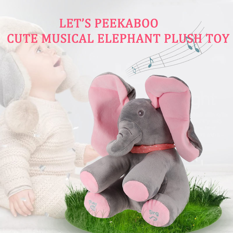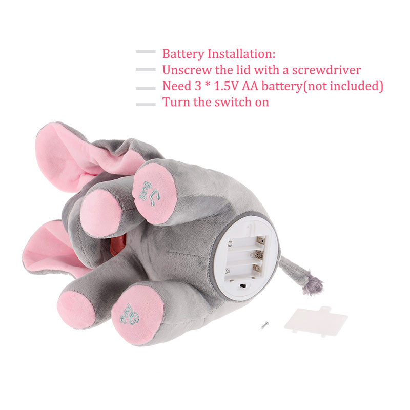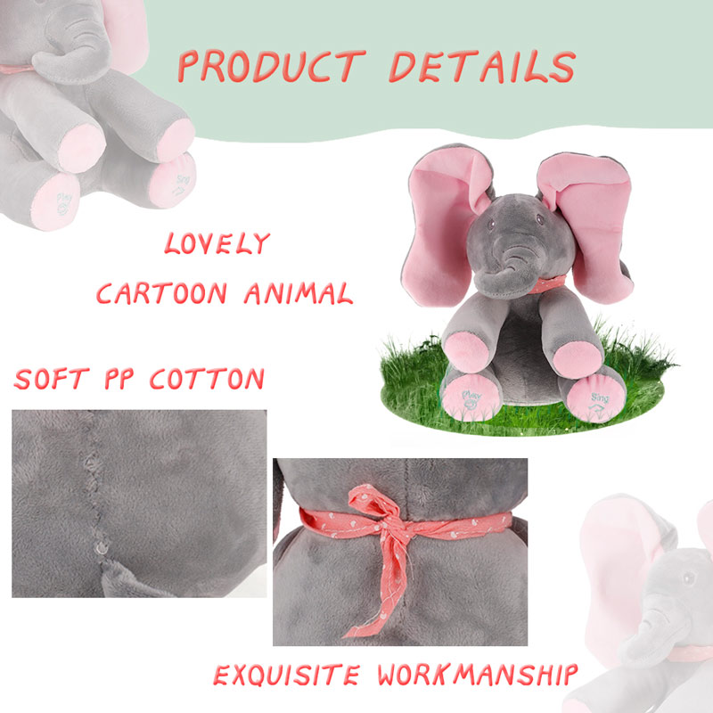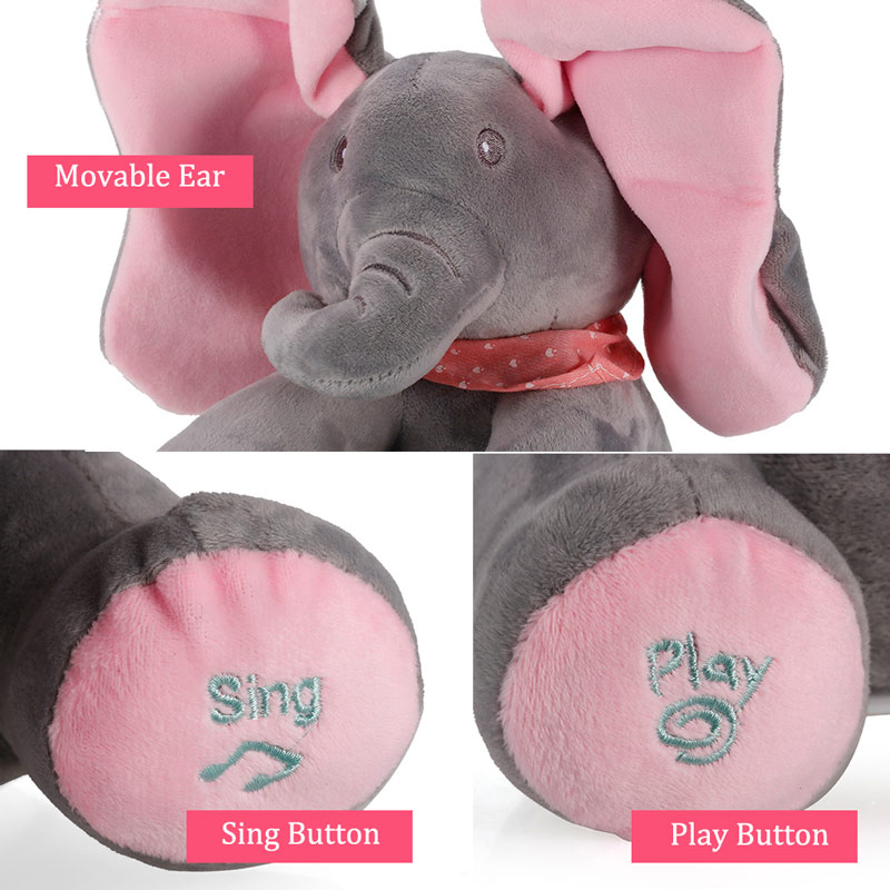Press the right foot (Play button) to play an interactive game of peekaboo. Ears will cover elephant's eyes, play with your baby hide and seek game!