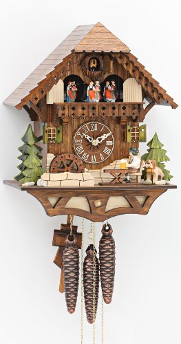 Studio : Kammerer Uhren Hekas Publisher : Kammerer Uhren Hekas Binding : Kitchen Product Description Colour: Walnut Wooden dial, wooden hands, wooden bird, and night shut off 2 years product warranty The cuckoo calls every half hour once and the number of the hours every full hour. This cuckoo clock has an exclusive life-like wooden handpainted cuckoo. With certificate of authenticity from the Black Forest Clock Association (VdS). It has a mechanical extreme long-life rack strike movement. It allows turning the hands left and right without endangering the mechanics of the movement. The 1 day running time movement need to be wind up every day, that means you pull on the chains until the weights are up. The music box is from the marketleader REUGE in switzerland. The size refers only to the clock, without pendulum and weights. 0