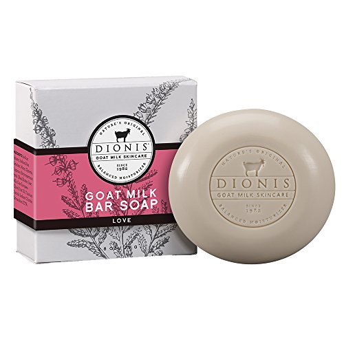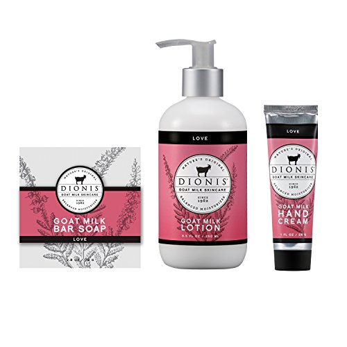Dionis Goat Milk Skincare three item set that includes one 2.8-oz milled Bar Soap, one 8.5-oz Body Lotion and one 1-oz tube of Hand Cream in "Love" scent.