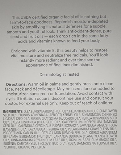 This USDA certified organic facial oil is nothing but farm-to-face goodness. Replenish moisture-depleted skin by amplifying its natural defenses for a supple, smooth and youthful look. Think antioxidant-dense, pure seed and fruit oils - each drop rich in the same fatty acids and vitamins known to feed your body. Enriched with Vitamin E, this beauty helps to restore vital moisture and neutralize free radicals. You'll look instantly more radiant and over time see the appearance of fine lines diminished.Feature