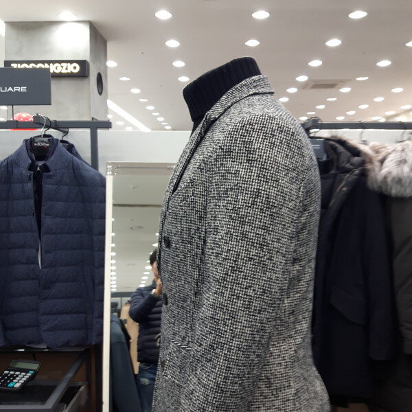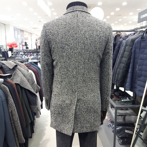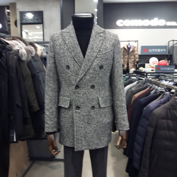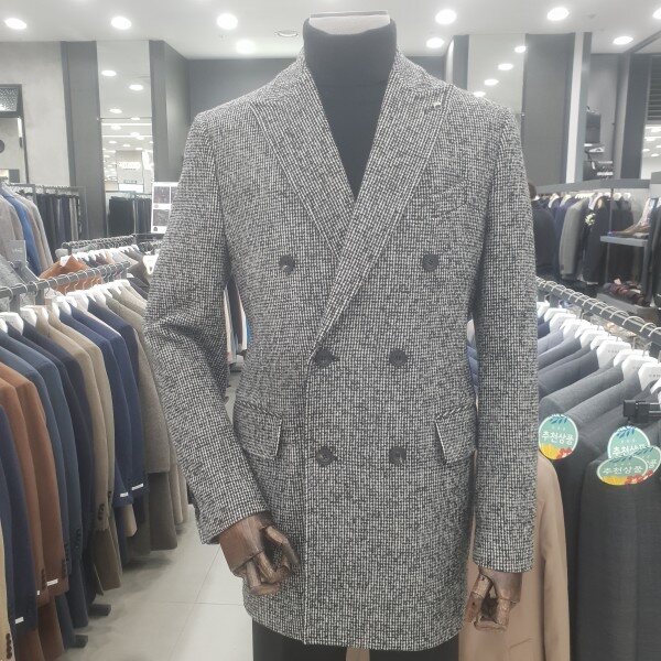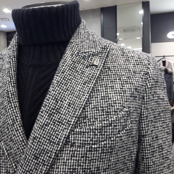 78기장의 짧은 더블코트로 쟈켓대용으로 활용하기 좋음.하운드 투스 체크 패턴과 유사하여 하의 코디가 용이