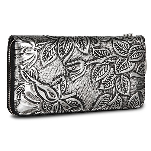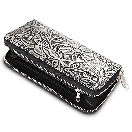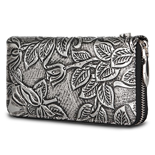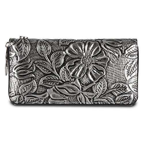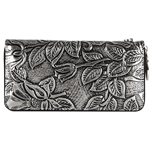 -. Brand : Letigo -. Color : Silver -. Department : womens -. EAN : 0750810601224 -. Feature : 100% Genuine leather that is both beautiful and durable. / It is very roomy inside and has eight card slots for your credit cards and ID's. One zipper pocket is in the middle for change and room on both sides for money and receipts or whatever you like. you can even fit 5.5 inch cell phone inside without a problem. / Zip around design that let's all valuables are safe and secure, don't have to worry about anything falling out or getting lost. / You can attach the handle that comes with it and use as a wristlet to carry by itself or just simply use as wallet and carry down in your purse. / Measures:19x10x2cm -. ProductGroup : Shoes -. ProductTypeName : HANDBAG -. Size : 19*2*10cm -. Title : Women's Genuine Leather Flower Zipper Clutch Wallet Purse (Silver) -. UPC : 750810601224