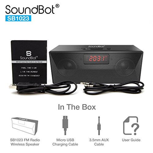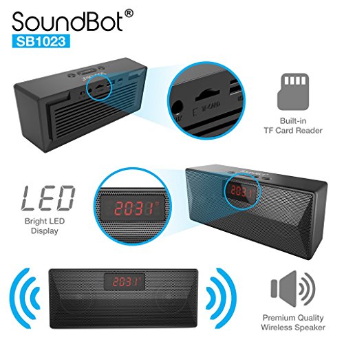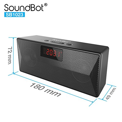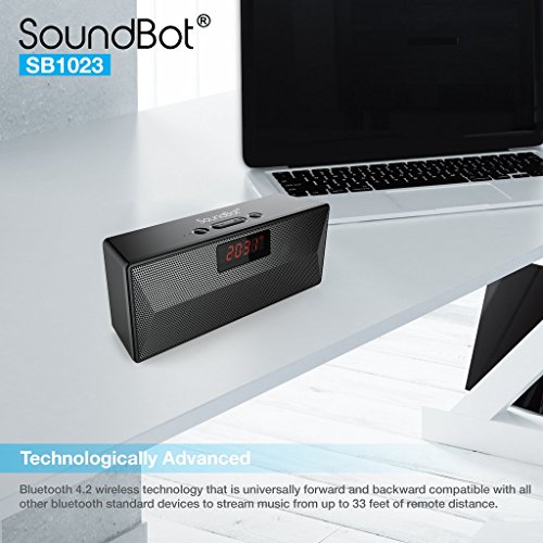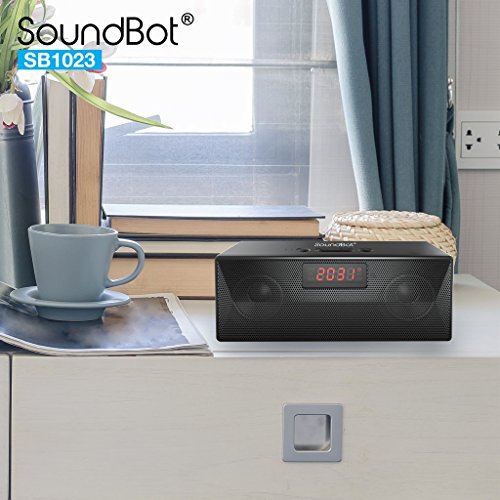 SoundBot SB1023 FM Radio Bluetooth 4.2 Wireless Portable Speaker Alarm Clock w/ 8hrs Music Streaming & 10hrs Hands-Free Calling, 4W + 4W 45mm Acoustic Sound Driver, Built-in Mic, Clock Display