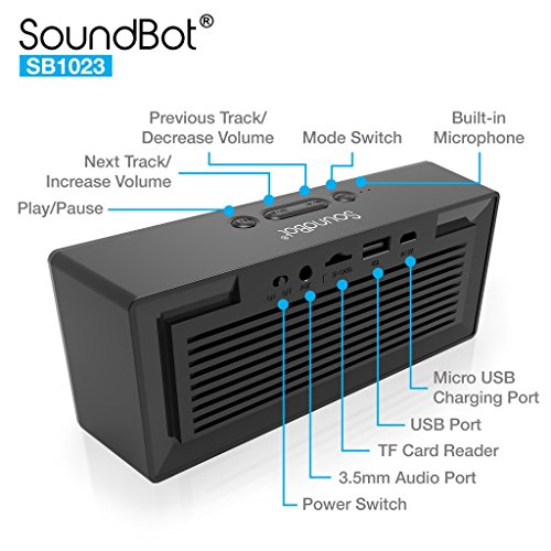 - ADVANCED BLUETOOTH 4.2 TECHNOLOGY - Universal audio wireless connectivity that is forward and backward compatible with seamless streaming, up to 8 hours of playback time and 10 hours of talk time, from up to 33 feet of remote distance. Built-in 3.5mm audio line-in 3.5mm jack port allows SB1023 to connect to media devices WITH OR WITHOUT Bluetooth capability.