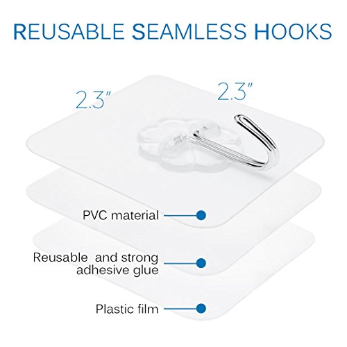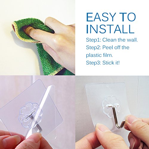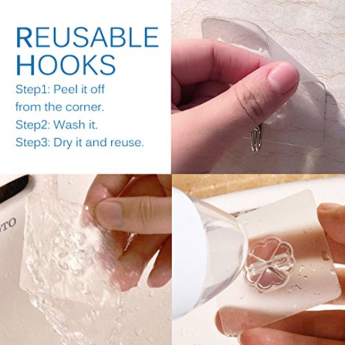 - ▶ EASY TO USE AND REUSABLE: Just peel off the film, then put the hook on smooth surface like wood, tile, ceramic, metal surface and more. (Please pay attention that there are limits on painted walls, it may damage the wall because of the strong adhesion.) REMOVE AND REUSABLE: Easy to clean and reposition without surface damage. It can be repeated using after water cleaning and drying with hair dryer or air-dry.
