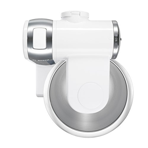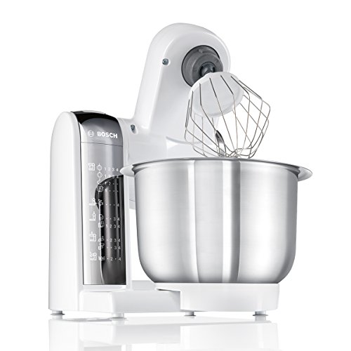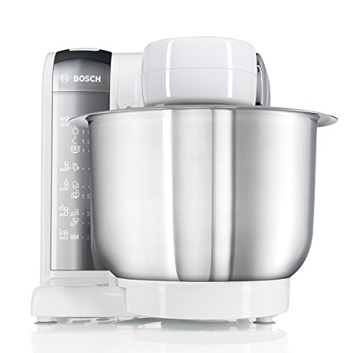 -. Feature : Einfach und sicher zu bedienen (Bosch Technik); leicht zu reinigen (Spülmaschinen geeignetes Zubehör) / Praktischer Alleskönner mit großer Rührschüssel aus Edelstahl (3,9l, max. Teigmenge 2,0 kg) / Vielseitig einsetzbar mit Patisserie-Set (Schlagbesen, Rührbesen, Knethaken), Durchlaufschnitzler mit 4 Scheiben zum Raspeln, Reiben, Schneiden und für Klöße/Reibekuchen, Mix-Aufsatz und Zubehörträger / Dynamisches 3-D Rührsystem MultiMotion Drive für optimales Vermengen der Zutaten / Individuell erweiterbar mit einer Vielzahl an hochwertigem Zubehör sofern noch nicht im Lieferumfang enthalten z.B. Eisbereiter, Getreidemühle, Multimixer, Spritzgebäckvorsatz, Fleischwolf, Mixer, u.v.m. / Lieferumfang: Küchenmaschine, Mixeraufsatz Kunststoff, Raspelwendescheibe, Reibscheibe grob, Reibscheibe mittelfein, Rühr-/Schlagbesen, Schneidwendescheibe, Zubehörträger, Deckel, Durchlaufschnitzler, Edelstahl-Rührschüssel, Knethaken Metall, Rezept-DVD