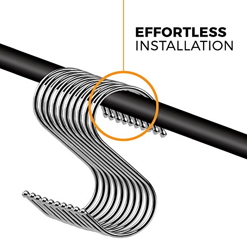 - EFFORTLESS INSTALLATION - Designed with S shape, simply attach one end of the metal hook on an edge, while the other end carries the weight of your items. Easy and won’t fall easily.