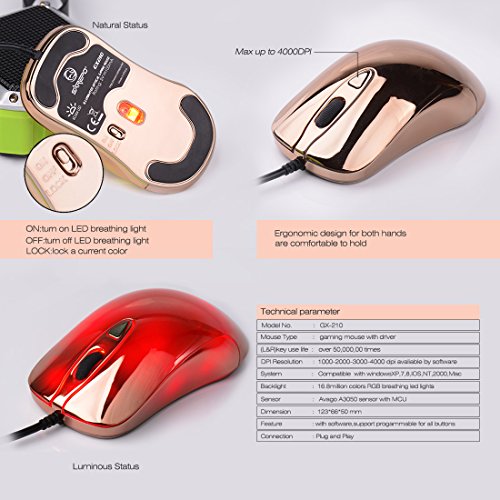16.8 Million RGB Color Options - The Gaming Mouse can omit 6 different colors as standard but with the gaming software the mice can be programmed to omit 16.8 millions colors. Also unlike any other gaming mouse the whole body of the mouse will illuminate in the color of your choice. Or you can just simply have it in the stunning electroplated gold