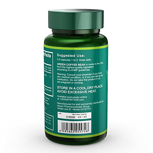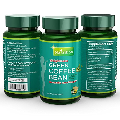 -. Binding : Health and Beauty -. Brand : Na'trition -. EAN : 6285862055748 -. Feature : Green Coffee Bean Extract - Standardized 50% of chorogenic acid, the main component in green coffee that has antioxidant property - PURE and Natural extract from raw coffee bean* / Weight Management - Some research shows Green coffee may help with weight control by lowing blood sugar and blocking fat buildup - activate fat metabolism and absorb fat from food intake - Take one in the morning, burn fat while working* / Made in U.S.A. - FDA-Inspected Facility - We strictly follow good manufacture practices and deliver the best quality product to customer! / 3~4 Months Supply - 180 Capsules -. Label : USA HPSON Pharmaceuticals Group LTD. -. LegalDisclaimer : Legal Disclaimer Actual product packaging and materials may contain more and different information than what is shown on our website. We recommend that you do not rely solely on the information presented and that you always read labels, warnings, and directions before using or consuming a product. Please see our full disclaimer below. -. Manufacturer : USA HPSON Pharmaceuticals Group LTD. -. ProductGroup : Health and Beauty -. ProductTypeName : HEALTH_PERSONAL_CARE -. Publisher : USA HPSON Pharmaceuticals Group LTD. -. Studio : USA HPSON Pharmaceuticals Group LTD. -. Title : Na'trition Green Coffee Bean Extract Weight Loss Supplement, 60 Capsules (3 Pack)