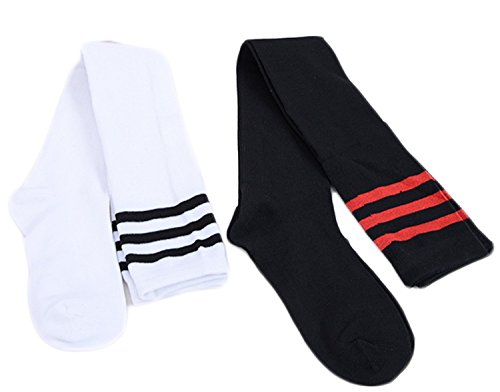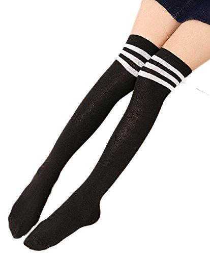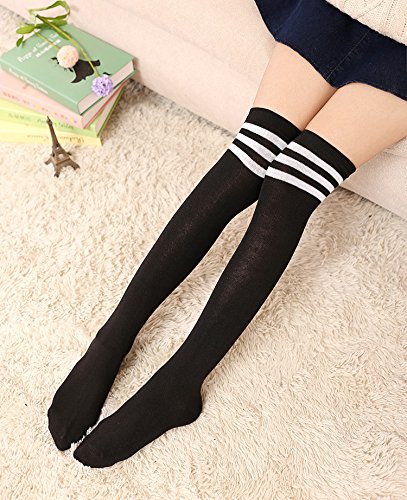 -. Feature : Fashion design super cute over-the-knee cotton socks for both women and big girls all year long! Very comfortabl stretch for daily wear, long walking or office use. True knee-high cotton socks with strips near mid thigh to define your fashion tastes all day long! / Extra softness and excellent stretchability in this thigh high cotton socks due to high percentage of spandex to your beautiful legs standout in the crowd and in the cold! Versatile color choices to match with your proud collection of boots, shoes and outfits 365 days a year! / Size: US 5-9; Bottom Length from toe to heel: 7"; Measurment length from heel to thigh: 21" / Premium over knee high cotton socks with strong moisture management capability, tight grip on your leg with gentle touch on the skin! They woll not slouch down like many other knee socks and they stay up all day long and after wash! These are the only design over knee high cotton socks with thin to medium thickness you are looking for! / Seven colors/patterns: black with red strips,black with blue strips,white with blue strips, white with pink strips,black with Coffee strips and black with purple strips