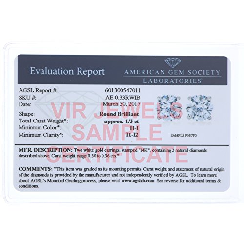-. Binding : Jewelry -. Brand : Vir Jewels -. Department : womens -. Feature : Jewelry Gift Box Included. Each product is tagged by AGS with a unique number that matches the certificate. / Total Diamond Carat Weight Of The 2 Stones Is 0.33 CT / 14K White Gold ; Screw Back Earrings / AGS Certified. Certificate Included. / Diamond Earrings Are Handcrafted in New York -. Label : Vir Jewels -. Manufacturer : Vir Jewels -. Model : FD9S0.33RWI_AE6 -. MPN : FD9S0.33RWI_AE6 -. PackageQuantity : 1 -. PartNumber : FD9S0.33RWI_AE6 -. ProductGroup : Jewelry -. ProductTypeName : FINEEARRING -. Publisher : Vir Jewels -. Studio : Vir Jewels -. Title : AGS Certified 14K 1/3 CT Diamond Stud Earrings White Gold (I1-I2, N-P) With Screw Back
