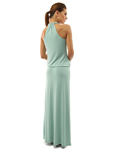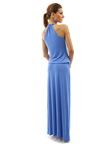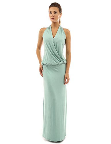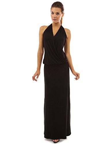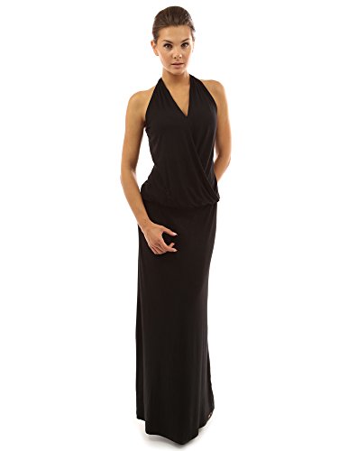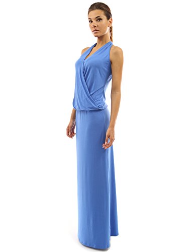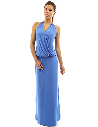 Product DescriptionHalter Faux Wrap Sleeveless Full Length Summer Blouson Maxi Dress. Elastic band at the waist. Model in pictures is 5 feet 8 inches (173cm) tall wearing a pair of 3 inches high heels.0