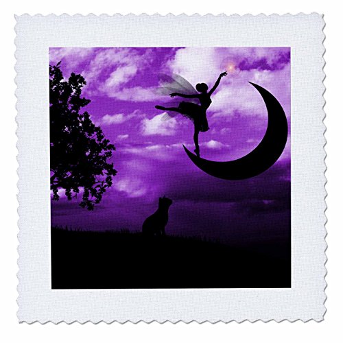 3dRose qs_111099_3 Fairy Dancing on Crescent Moon with Cat and Purple Sky Quilt Square, 8 by 8-Inch