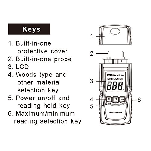 - ACCURATE WOOD MOISTURE TESTER: Measuring Range: 0%-40%, Accuracy: +/-0.5%, Stick integrated Electrode pins into the surface of what you are measuring in order to get a read-out
