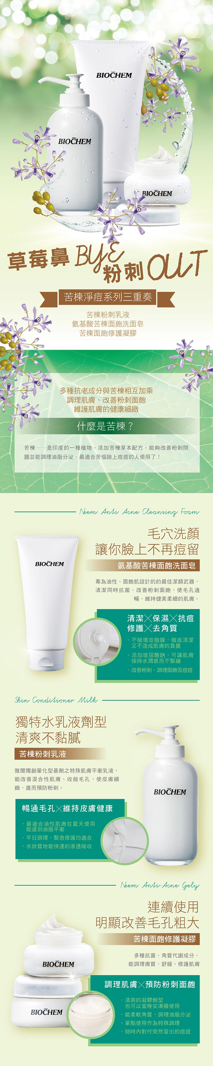 It is an oil and dirt removal cleansing foam especially designed for the concerns of acne, suitable for oily to combination skin types. With cleansing and anti-bacteria functions, Neem Anti Acne Cleansing Foam helps maintain healthy and tender skin.