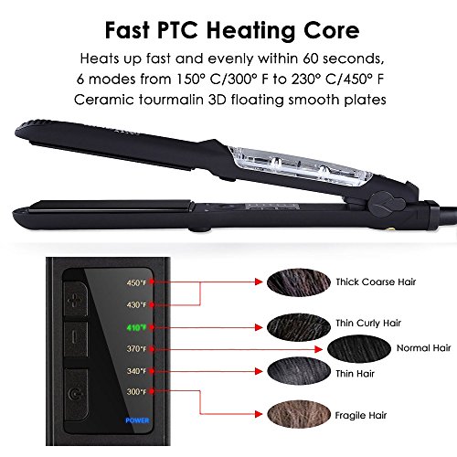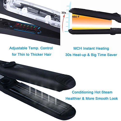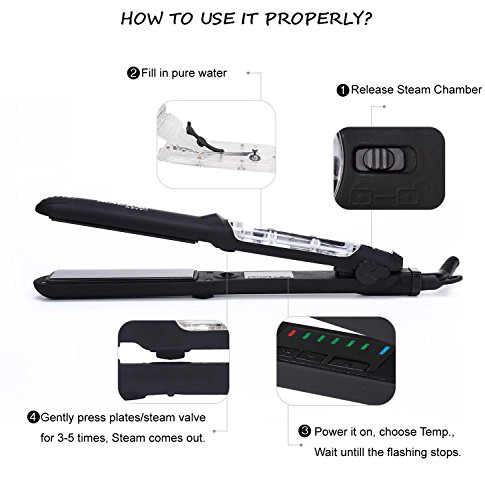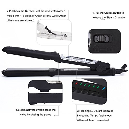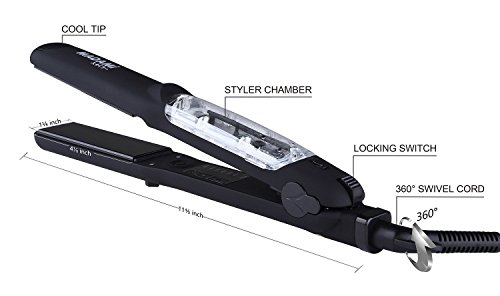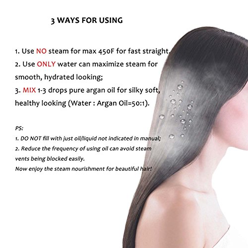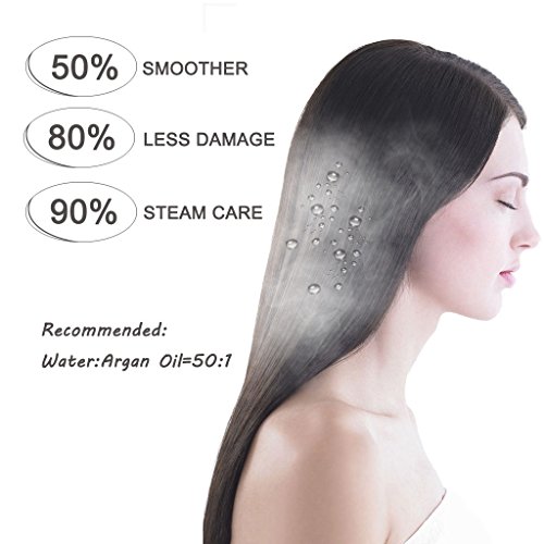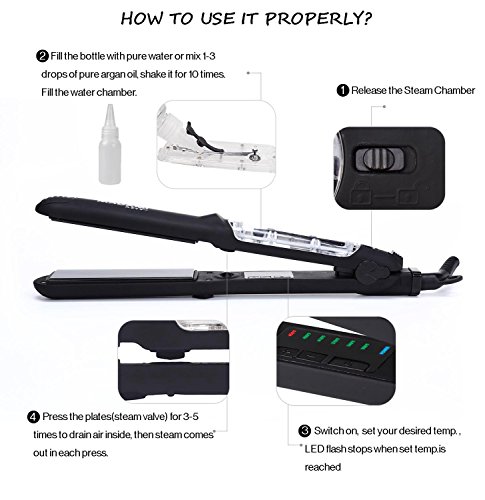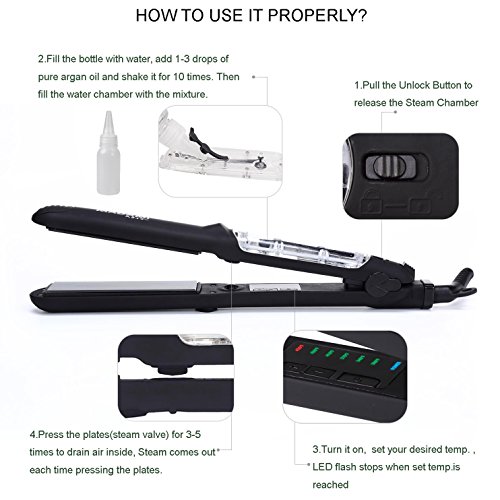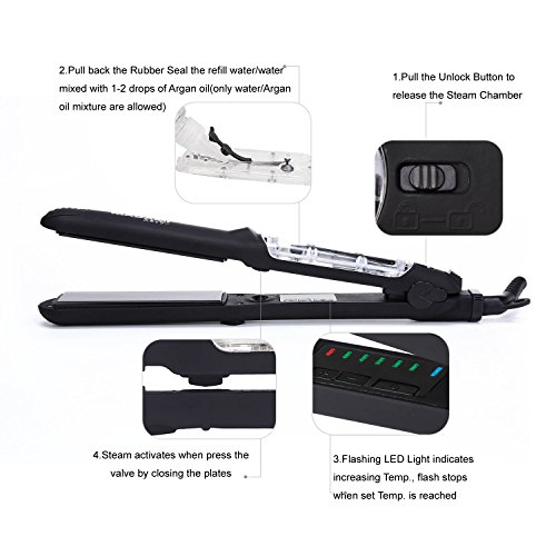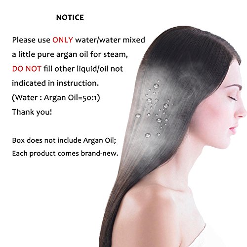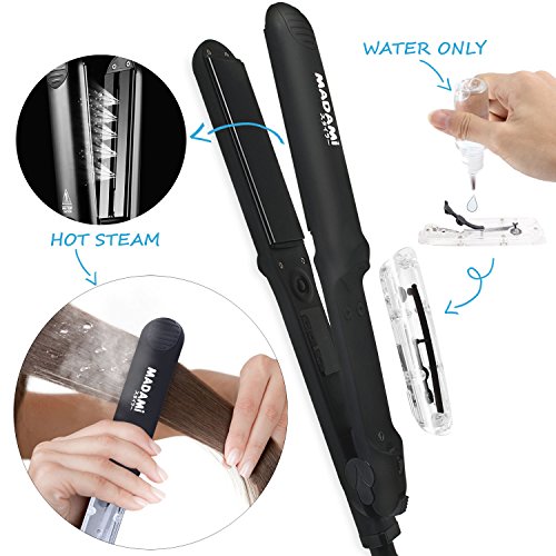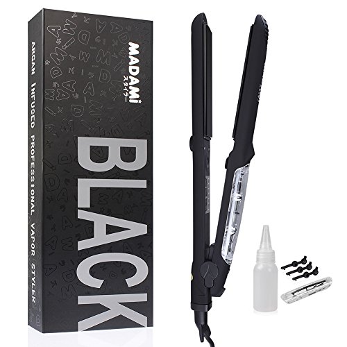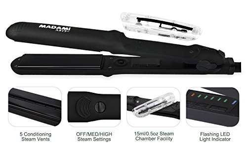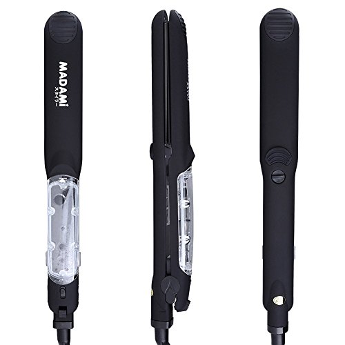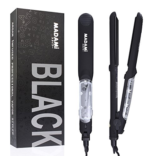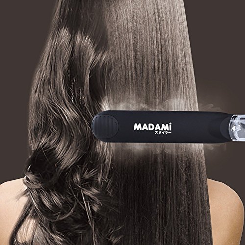 By adapting the newest teach in hot hair tools industry, MADAMI Argan Steam Styler perfectly combines nano ceramic, ionized tourmaline and steam function into one. With hair follicles-friendly conditioning steam, evenly running out from 5 power steam outlets, the steam infuses moisture back into your hair, locking hair natural oil and adding more shine to the finish. Blending with nano ceramic and ionized tourmaline floating function plates, the iron glides through your hair at ease, taming the problematic frizzy hair and reducing risks in hair splits. With 1-2 drops argan oil mixed inside the steam, you can easily enjoy salon grade hair treatment, just at home. 1 1/4 inch perfect width plates, straighten voluminous hair or create charming waves, getting the jobs done "neat and tidy". Get healthy styling fashion from a little help of MADAMI Argan Steam Styler - the BLACK version. 0