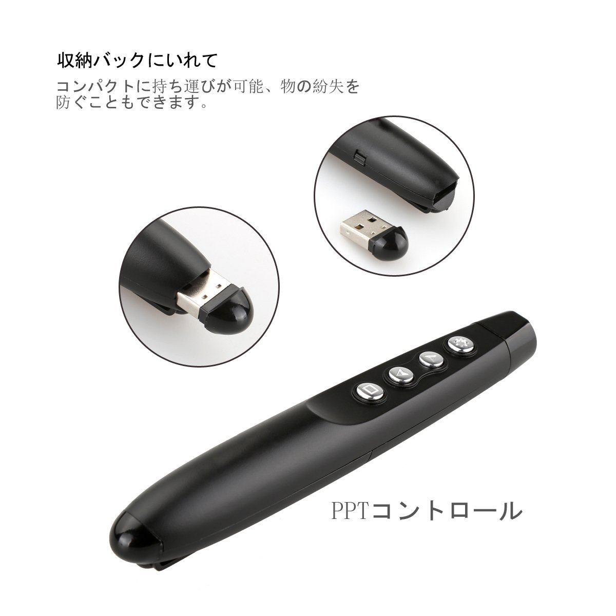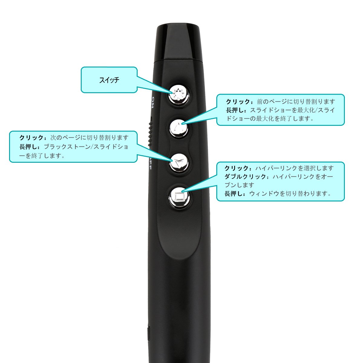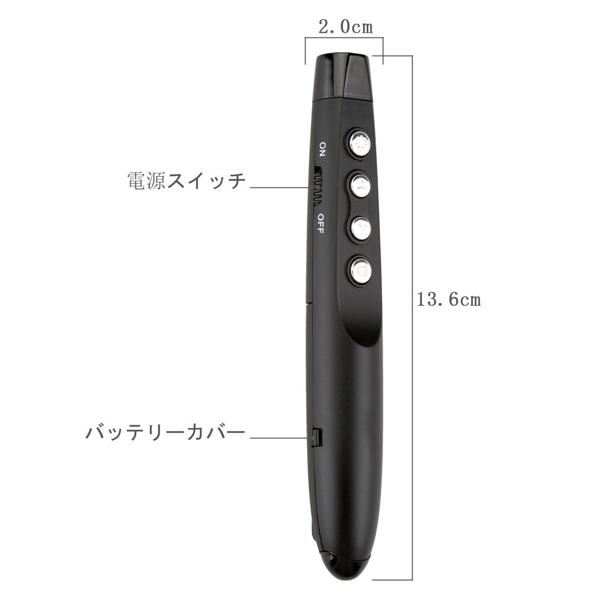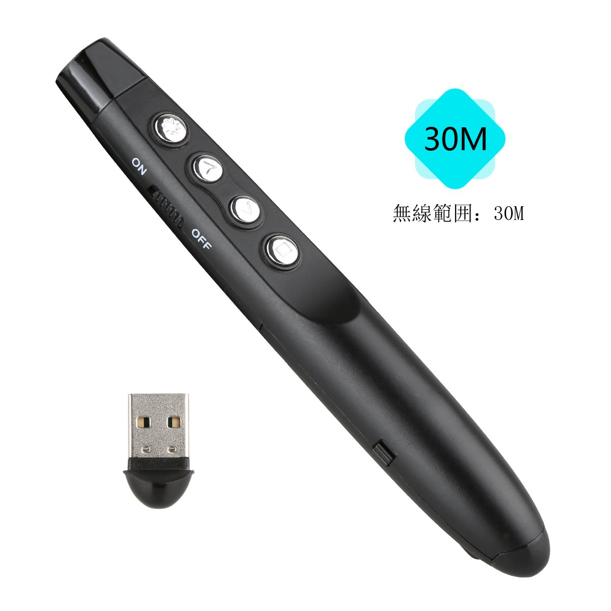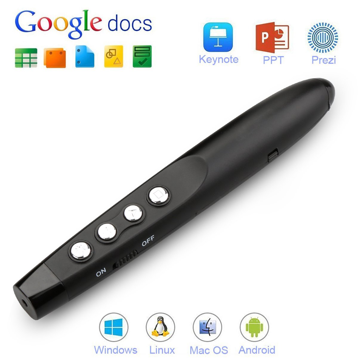 Wireless pointer that works for systems such as Windows OS, MAC OS, Linux, Android, and is active in meetings, presentations, exhibition halls, on-site work and so on.