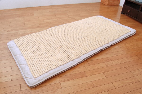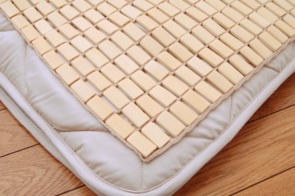 髪の毛や体毛がひっかかりにくいよう、フレームに柔らかいPPを使用した竹のシーツです。フレームが柔らかいので、どこからでも折りたたむことができ、コンパクトに収納できます。また竹駒のサイズは28mm×15mmと一般的なものよりひとまわり小さくしていますので、より体にフィットします。素材は麻雀竹の産地である福建省で育った天然の竹を使用しています。猛宗竹のひんやり感のある表面部分を使用しています。竹の表皮は、熱を吸収する機能に優れています。竹の持つこの特長が、ひんやりとした肌さわりをもたらします。綿素材と比較して体感温度が下がり、寝苦しい夜を快適にサポートしてくれます。マットレスなどの上に敷いてもぴったりとフィットして竹の硬さを感じません。竹の表面に天然青森ヒバ加工を施しています。(抗菌、防臭効果)青森県のヒバの木から抽出した「ヒバ油」を現地に送り、メーカー独自の技術で材料や商品に加工しました。「ヒバ油」には、ヒノキチオールという天然物質としては極めて抗菌性の高い成分が含まれ、医療や食品など多分野で利用研究が進められています。