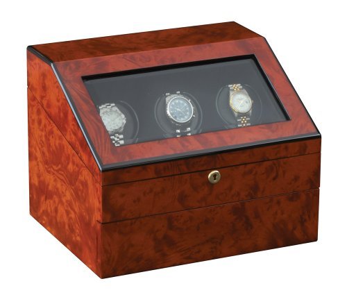 -. Feature : Outer Finish: Burl finish buffed to a High Gloss with a sloped front viewing window and pull-out drawer. / Interior Surface: Lined in Rich Suede for oscillating three timepieces and a pull out drawer to store up to 12 additional watches. / Programmable Sophisticated Microprocessor Control for winding cycles of 650, 800, 950, 1300 Turns-Per-Day (TPD).Programmable choice of Clockwise, Counter-Clockwise, or automatic reversing rotation. / Operates using either Alkaline C Cell Batteries or with a supplied wallplug AC/DC adapter. / Dimensions (inches): 10.25H x 13.5W x 10.5D Made in the USA