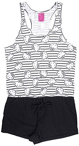 This one piece features an all over pattern on the top half with solid color shorts. It is made of 60% cotton, 40% polyester. Hello Kitty Sleepwear.