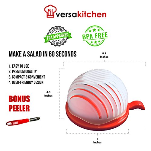 versakitchen Large Salad Cutter Bowl Complete with Peeler – FDA Approved & BPA Free – 60 Seconds Salad Maker – Vegetable / Fruit Slicer & Strainer Dual Use – New Color Red