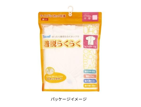 吸収性に優れ、肌触りのよい綿素材を用いた厚手の肌着です。取りはずしが楽に行えるホックを採用しています。 製造国:日本 素材・材質:綿100% 仕様:婦人用(半袖) ※サプライヤー直送品 ご注文後2~3営業日後の出荷となります【商品名】幸和製作所 テイコブ(TacaoF) らくホック肌着婦人用半袖 UN03 Mサイズ