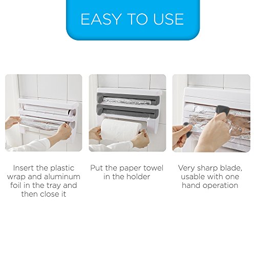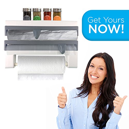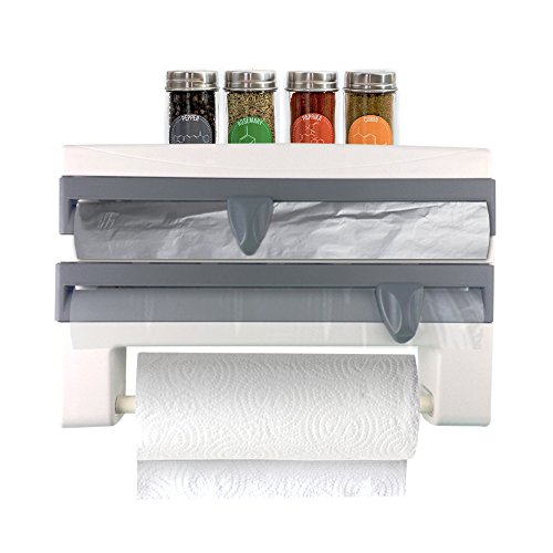 ---Super Multifunctional Space Saver--- This paper towel holder is a perfect space saver for regular paper roll. It serves as a plastic wrap and foil dispenser with ergonomic sliding cutter. The top part gives you an ideal spice rack.