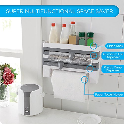 Kitchen Multi Dispenser | Multifunctional 4 in 1 Wall Mounted Organizer for Regular Size / Standard Plastic Wrap Aluminum Foil Paper Towel Roll Holder and Spice Rack | Screws Included | 1250.2