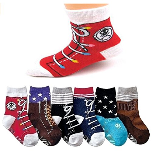 -. Feature : Baby Boys Star Shoe Socks is Ultimate Comfort! Made of 95% Cotton, 5% Nylon,Touch Soft,Have good elastic, / Skull Stripes Star Style Baby Gap Anti Slip Socks,Gripping soles lets your kids wear the socks around the house without your having to worry about them slipping and falling. Protect baby's feet when learning walk. / Baby Boys socks with grips ,Breathe freely, absorb sweat, odor resistant, anti-slip, comfortable,Suit for SP.R.Ing, summer and autumn. Recommended foot long 9 - 13cm (12-24Months ) toddler wear. / Adorable knitted socks,baby toddler grip socks,baby non skid socks, anti slip toddler slipper socks,Baby Shower gift,Not Worry About Slipping in The Kitchen or Bathroom. / Great as gifts/stuffers,Cute designs that come with assorted colors in a 6 pair-pack + 1 Gift Card.