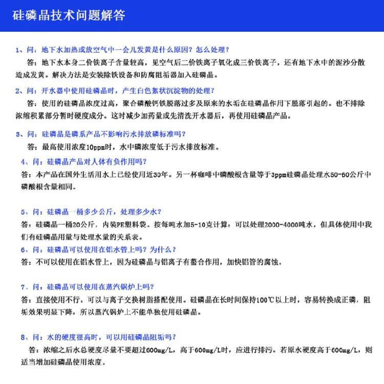 举例说明:比方你一天用水量是10吨,那么一个月的用水量是10*30=300吨水,需要消耗大约3公斤硅磷晶,咱们安3个月加一次料计算,3*3=9公斤