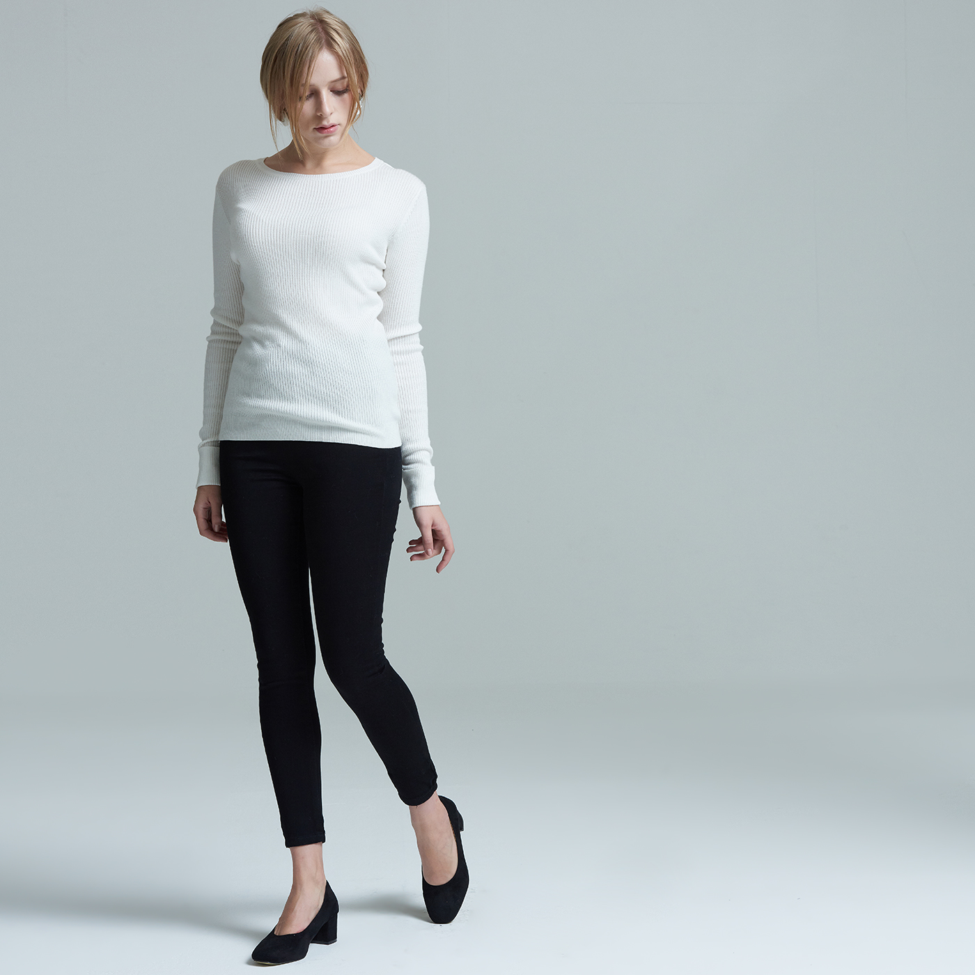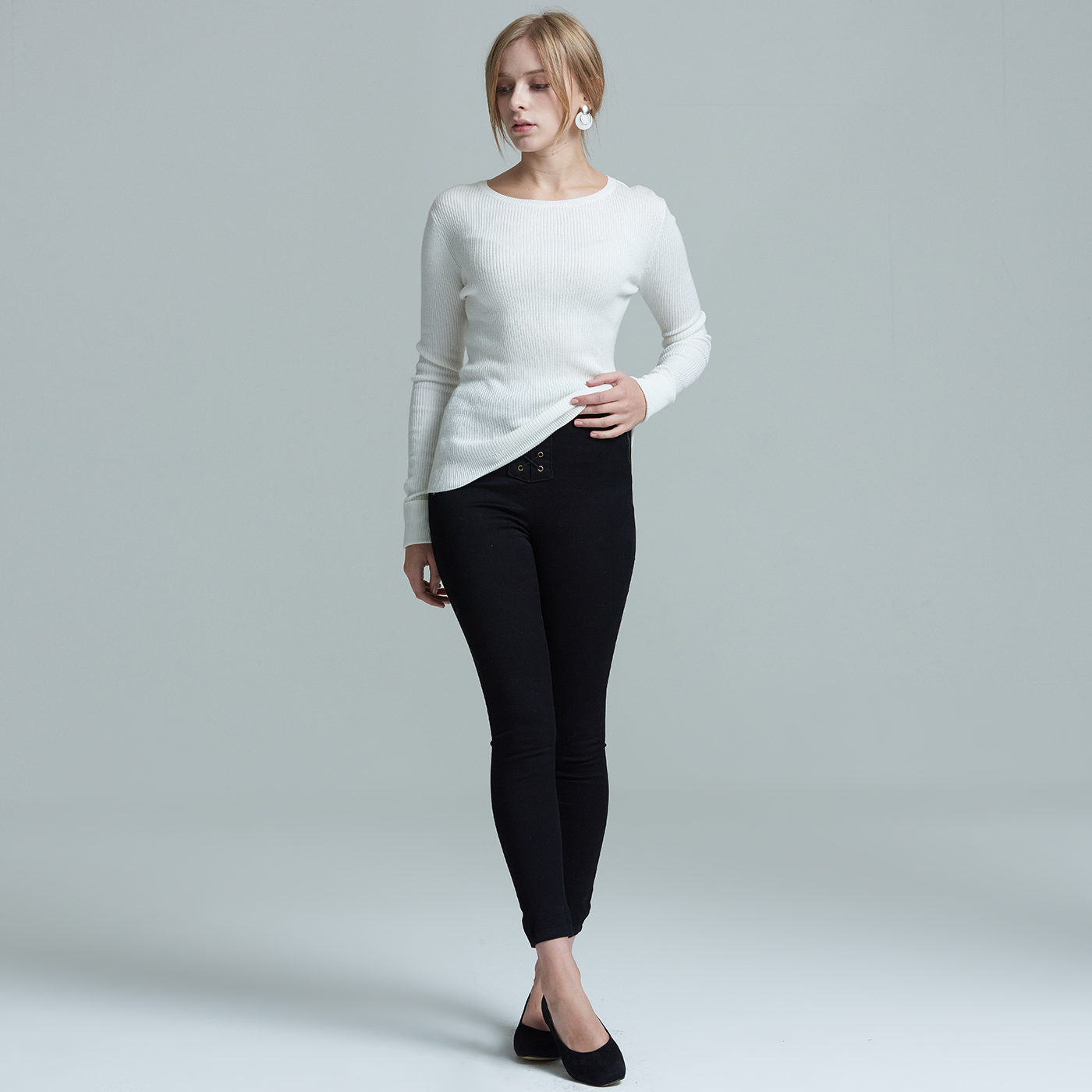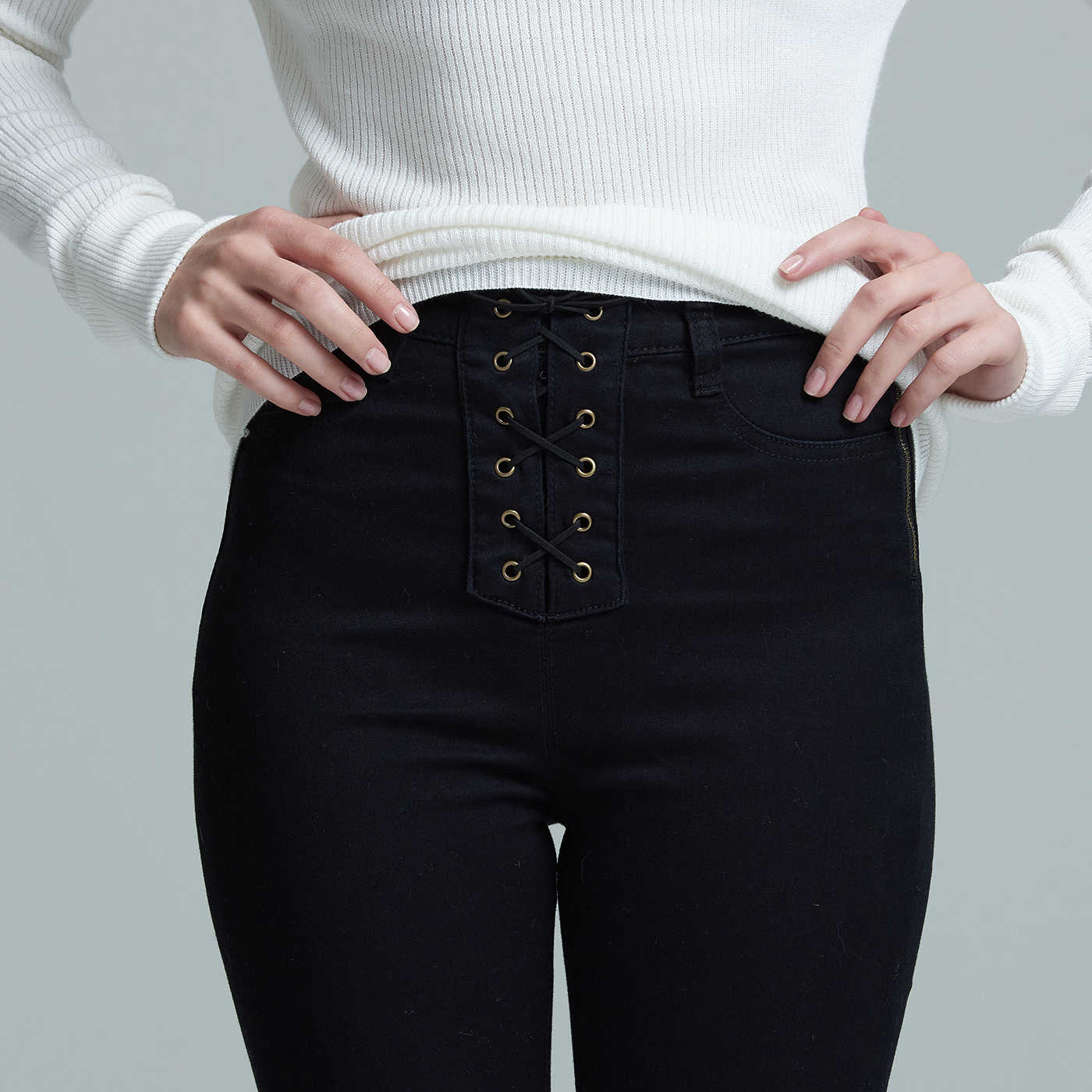 하이웨이스트 레이스업 디테일 팬츠로 시크하고 슬림한 스타일입니다.