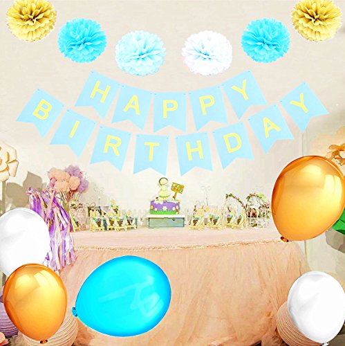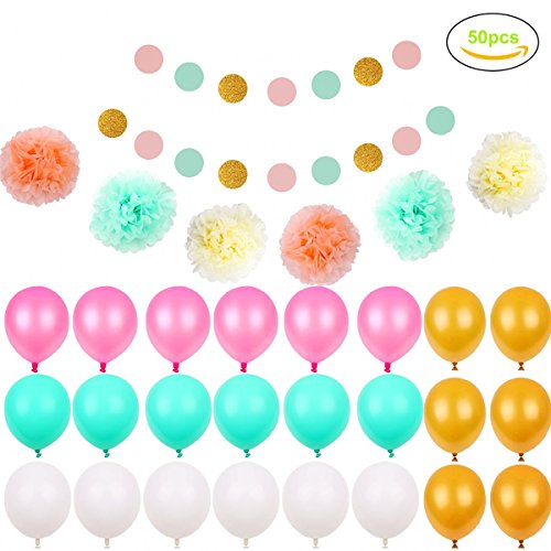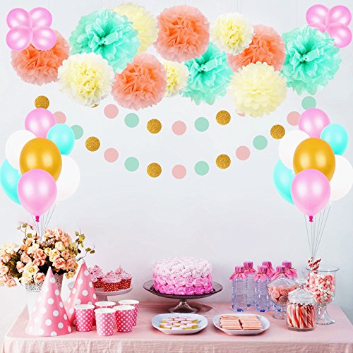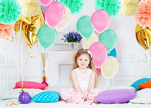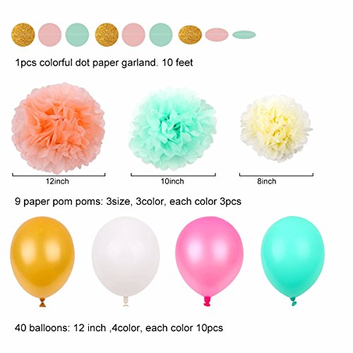 🌺🌺HIGH QUALITY AND LIGHTWEIGHT: The colorful balloons are made from durable latex material. It’s strong and long lasting, and you won’t have to worry about them tearing or bursting when inflated. The paper pom poms are lightweight and easy to Fluff, can be hung anywhere.
