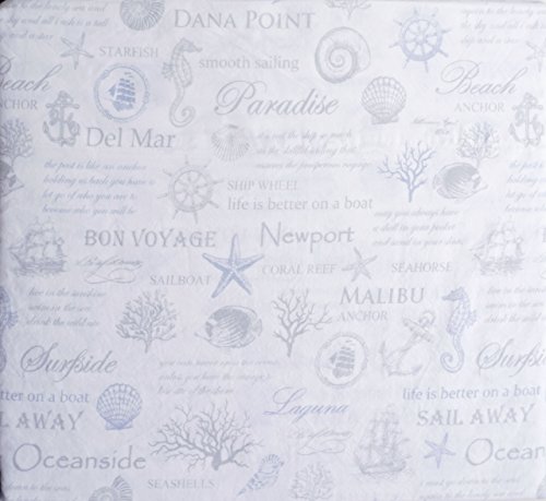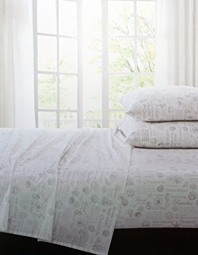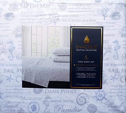 Ocean Beach Pattern, Shells, Anchors, Ships, 4 Piece King Size Sheet Set, 100% Cotton Percale, Light Gray on White, Envogue Bedding Nautical Collection -- Coast to Coast