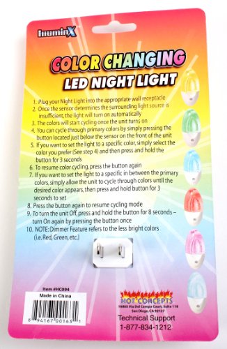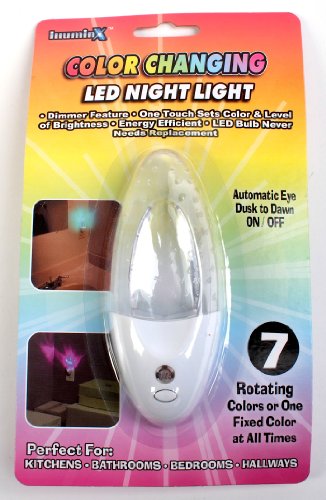 This Color Changing LED Nightlight is truly unique. It continually changes to 7 different colors. You also have the option to stop on any one color by pressing the small push button located on the base of the light. Automatic photo sensor turns light on at dusk and off at dawn. The LED bulb is guaranteed to last a lifetime. Decorative, upscale, crystal-like design. Cool to touch and safe for children. It consumes little energy and enhances the mood or setting in any room.Feature