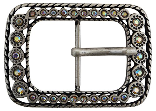- Metal buckle with an antique silver finish, rectangular with embellishment and rhinestones, bling buckle