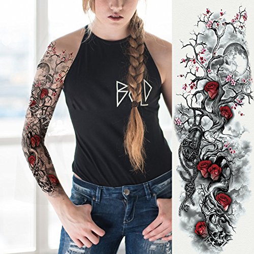 Kotbs 6 Sheets Full Arm Temporary Tattoo Waterproof Extra Large Temporary Tattoos Black Skull Rose Tattoo Body Stickers for Man Women Fake Tattoo