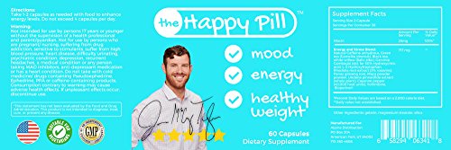 -. Feature : POSITIVE & POWERED-UP - "Bachelorette" star James Taylor, founder of THE HAPPY PILL, knows you need to be both in a great mood AND full of energy to get ahead in tough situations. That's why THE HAPPY PILL has BOTH mood supporters like L-5-HTP and Rhodiola Rosea, as well as thermogenic core energizers like Panax Ginseng and Garcinia Cambogia to keep you going. Want to feel emotionally and physically energized to be the best version of yourself? THE HAPPY PILL has your back! / ALL DAY EFFECT, NO CRASH - Have days when you feel like you woke up in a rut? You're stressed out before your feet even hit the floor. Well that's no way to live! Whether you've got a fast-paced day ahead in the classroom, office, or home THE HAPPY PILL is here to help. Order a bottle now, and get ready to make the most of your day with all-natural mood-support, thermogenic energizers, and antioxidants. / MADE IN THE USA - Proudly made in the USA / TOP QUALITY INGREDIENTS - GMP certified. 100% free of dairy, allergens, GMO, etc. / MONEY BACK GUARANTEE - If you're not 100% satisfied with your order, we'll refund your entire order. That's how confident we are with this product. No tricks, no excuses. Just the best guarantee around.