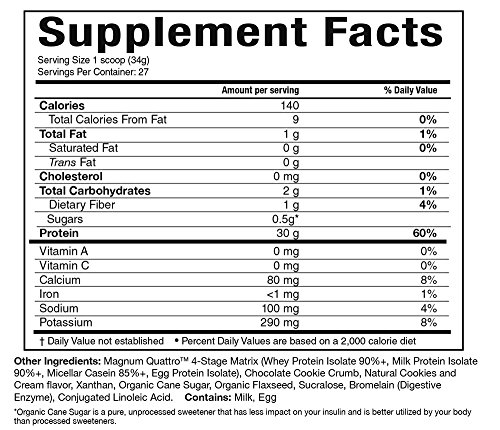 -. Binding : Health and Beauty -. Brand : Magnum Nutraceuticals -. EAN : 0689076000444 -. Feature : It has 4 different sources of Isolate protein for timed digestion / It has only Isolate proteins (the highest quality and form of protein - better digestion, absorption, and results) / It has added CLA and Flaxseed for essential fatty acids and protein assimilation / There is more protein per scoop than almost any product available today / Every ingredient is Pharmaceutical Grade -. IsAdultProduct : 0 -. Label : Magnum Nutraceuticals Inc. -. Manufacturer : Magnum Nutraceuticals Inc. -. MPN : 689076000444 -. NumberOfItems : 1 -. PackageQuantity : 1 -. PartNumber : 689076000444 -. ProductGroup : Health and Beauty -. ProductTypeName : HEALTH_PERSONAL_CARE -. PublicationDate : 2015-04-24 -. Publisher : Magnum Nutraceuticals Inc. -. ReleaseDate : 2015-04-21 -. Size : 27 Servings -. Studio : Magnum Nutraceuticals Inc. -. Title : Magnum Nutraceuticals Quattro Half-Baked Cookies and Creme Supplement, 2 Pound -. UPC : 689076000444