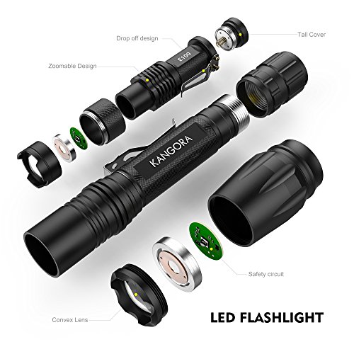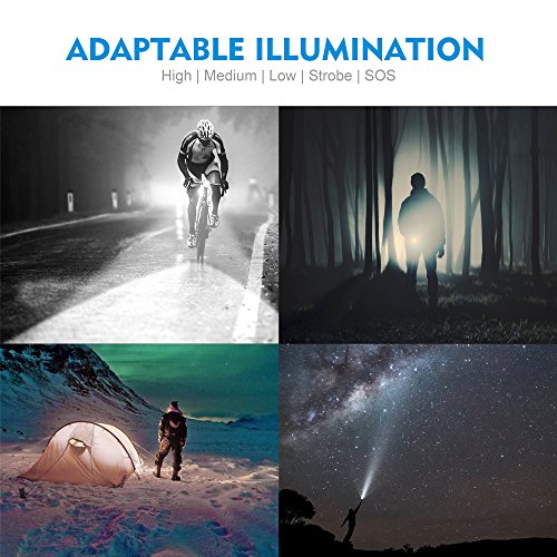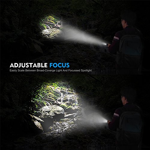 ✔ZOOM IN & ZOOM OUT: Features adjustable focus. You can extend the flashlight’s body with ease to focus spotlight, and pull back for broad-coverage light. You can chose from 5 different light modes: High, Middle, Low, Strobe, and SOS modes.
