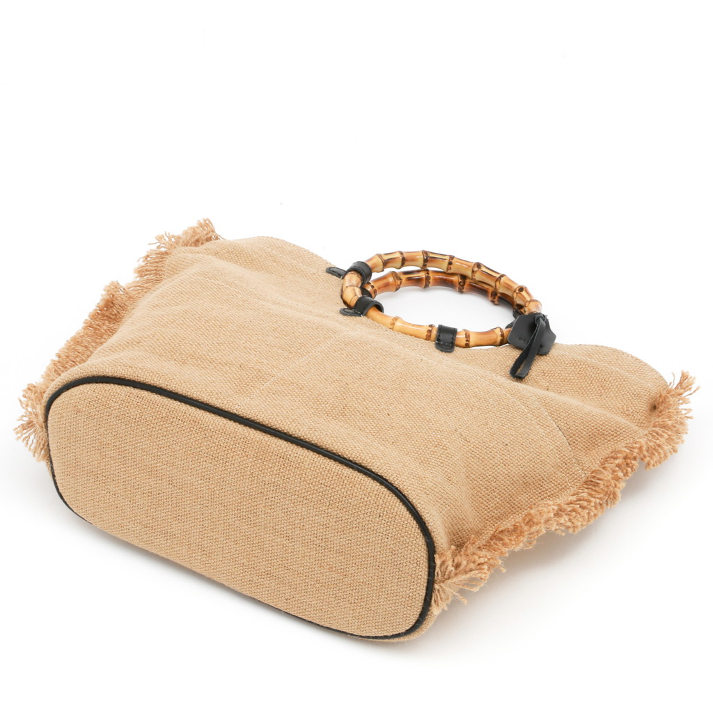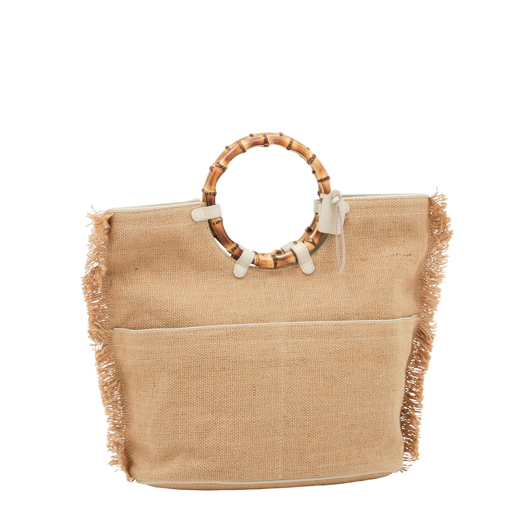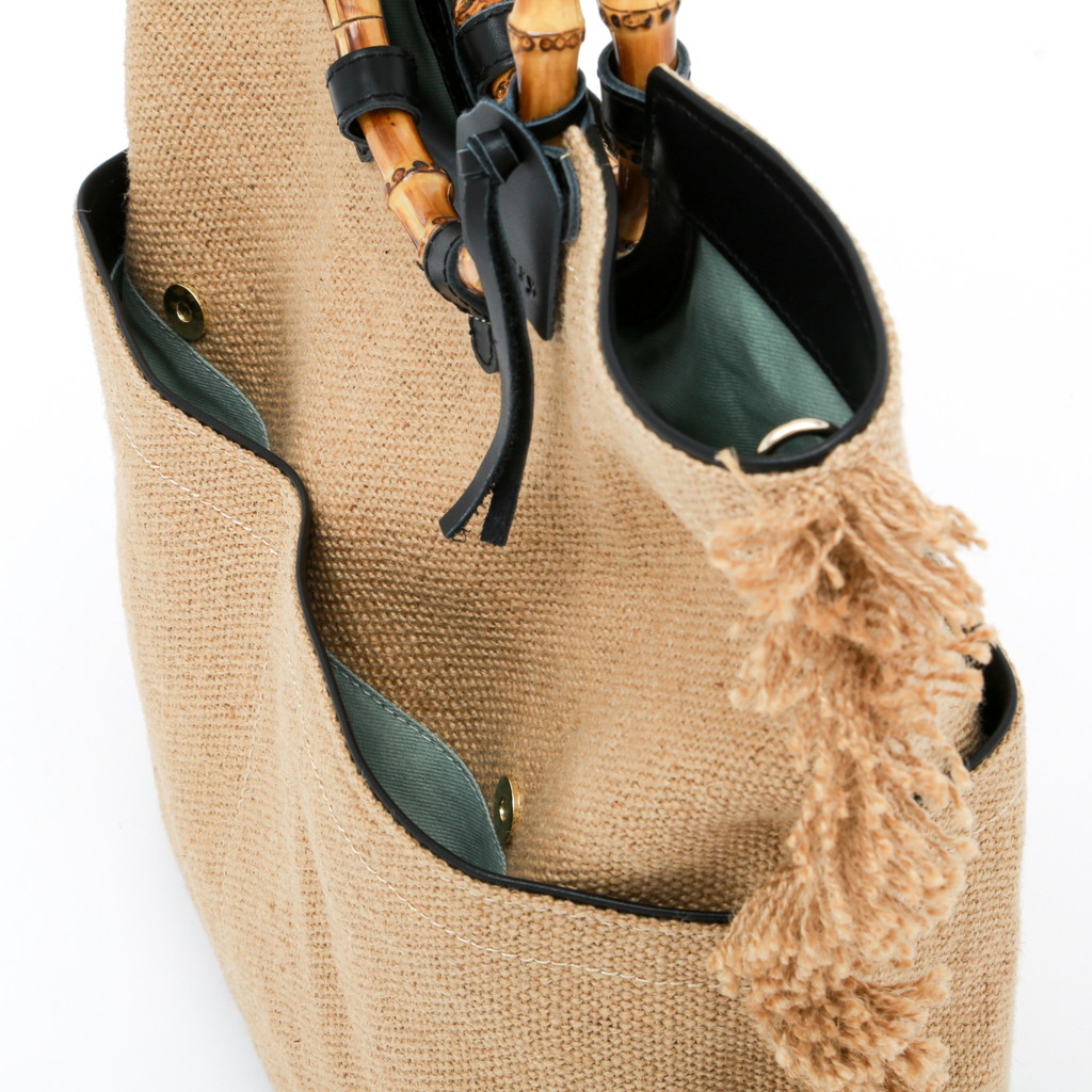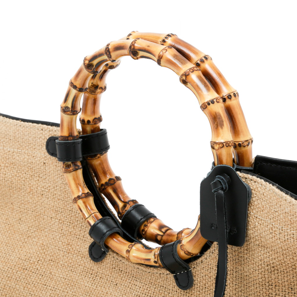円形のバンブーハンドルが特徴的な大きめのトート。リリネン×革のコンビや抜け感のあるカットオフなど、シンプルながらもリゾートライクな雰囲気がただよいます。ポケットも多く、容量が大きくたっぷり入るサイズはデイリーに持てる使い易さが魅力。取外し可能なストラップで肩に掛けてお使いいただけます。